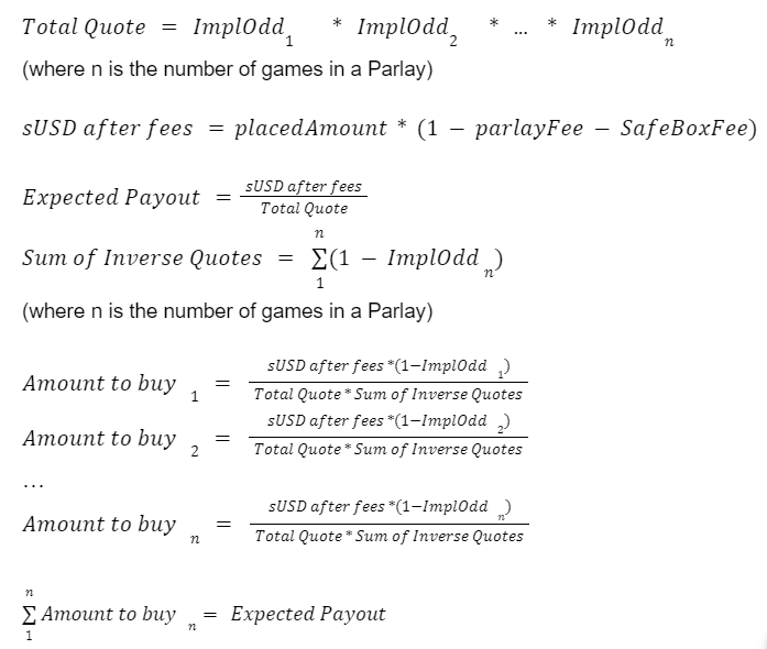 The ParlayAMM contract calculates the amount of individual ERC-20 Outcome Tokens to buy from the Sports AMM using the following formulas integrated into the smart contract architecture: